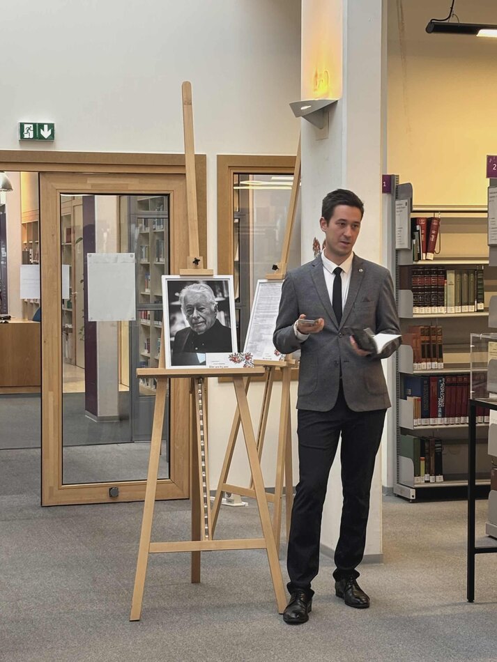 Exposition : Hommage à György Ferdinandy, écrivain hongrois présentée à la Bibliothèque des langues du 23 octobre au 20 novembre 2025. Nous avons eu l’honneur de célébrer cet hommage en présence de sa veuve, Madame Maria Teres Reyes, et de son assistant, Monsieur Navarrai Mészáros Márton.